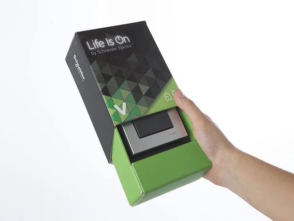 Boîte-nuancier en carton contrecollé-rembordé avec cale intérieure en PVC thermoformé pour la présentation d’un seul interrupteur. Boîte-nuancier en carton contrecollé-rembordé avec système d’ouverture type boîte d’allumettes pour la présentation d’un seul interrupteur. L’étui est fabriqué en carton contrecollé-rembordé et imprimé en 2 couleurs offset pelliculé mat. L’intérieur contient une cale noire en PVC thermoformé à la forme de l’échantillon.